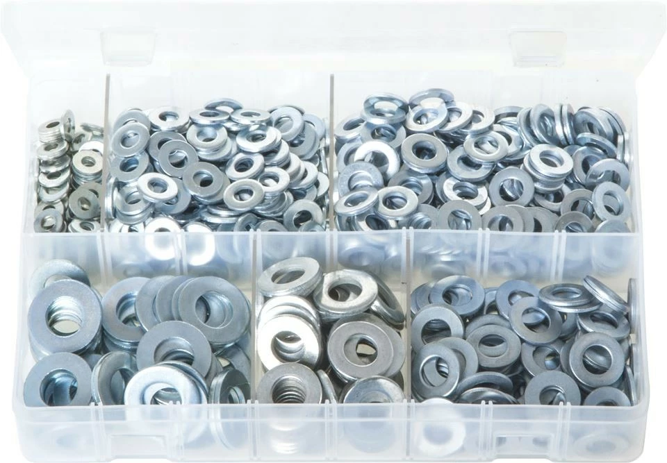 Heavy Duty, Imperial, Flat Washers, 800 pieces. Zinc plated and presented in a substantial, compartmentalised, plastic box.
